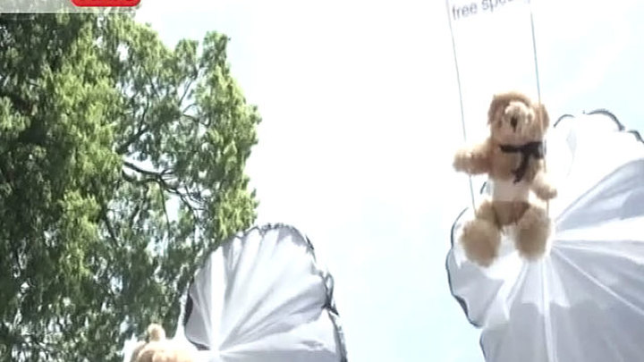 При этом над Ивенцом и Минском с самолета были сброшены на парашютах несколько сотен плюшевых медвежат с лозунгами в поддержку демократических процессов в Белоруссии.