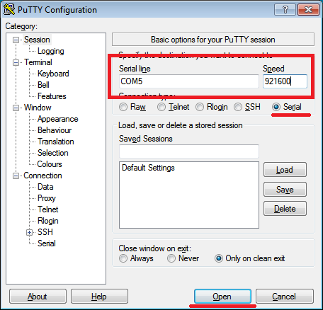 Запустим putty.exe из директории c:zte, там нажимаем на радиобатон Serial, в текстовом поле Serial line укажем COM5, это порт по которому у нас доступен модем, и Speed 921600, и нажимаем Enter (ну или Open).