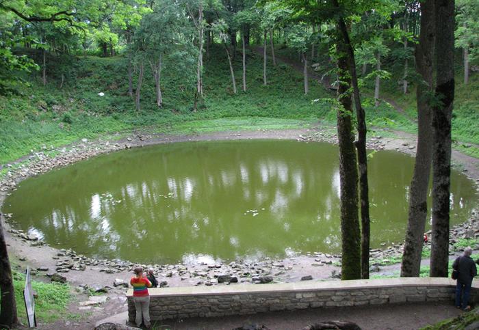 Метеоритный кратер Каали - 100-метровый кратер, оставленный метеоритом и называемый "могилой солнца". Ученые спорят о времени падения метеорита: одни считают, что это событие произошло 2400 лет назад, другие – 7500 лет назад. В земную атмосферу вторгся железный метеорит, весом в 400 тонн, не долетя до земной поверхности, он раскололся на 9 частей, ударившись об неё со скоростью 20 км/секунду. До сих пор известно 9 кратеров, возникших при столкновении. Наибольший - главный кратер имеет диаметр 110 м, маленькие - от 13 до 39 метров в диаметре. В главном кратере образовалось маленькое озеро, уровень воды в котором колеблется в зависимости от времени года. Остальные кратеры так же можно осмотреть, но мы ограничились только самым большим.