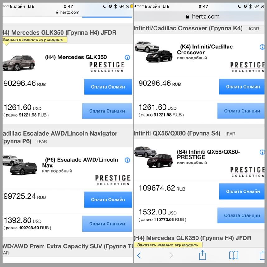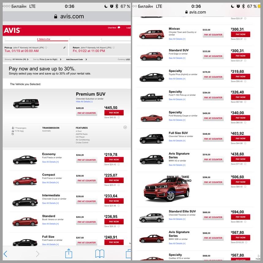 Цены одинаковые +- какая-то мелочь. Сначала аренда в JFK. Вот сравните цены на практически все классы предлагаемых конторой автомобилей.