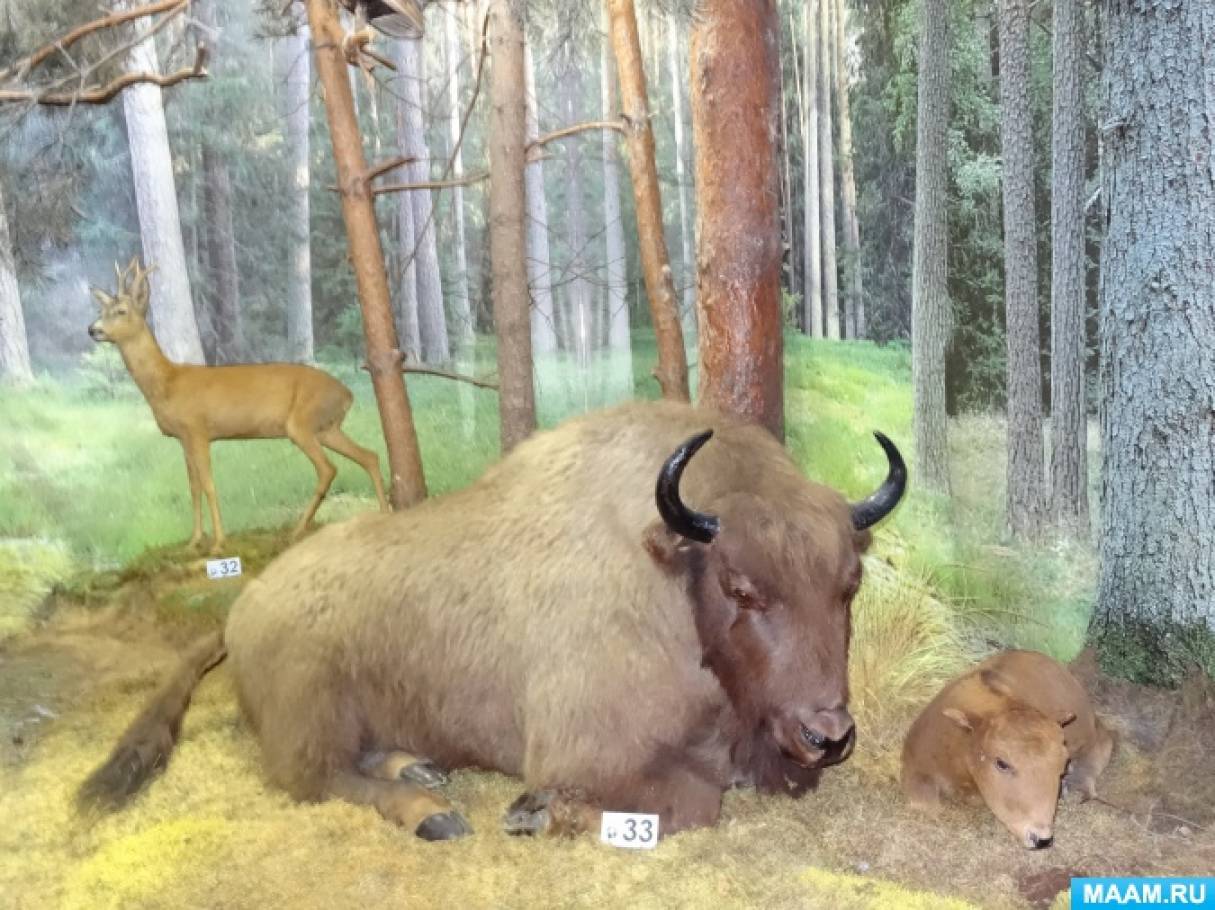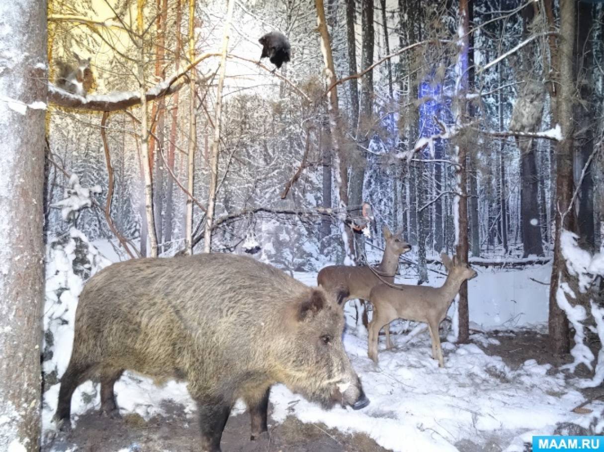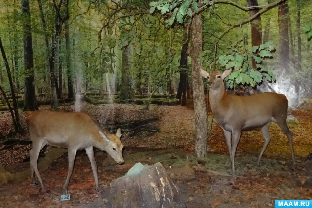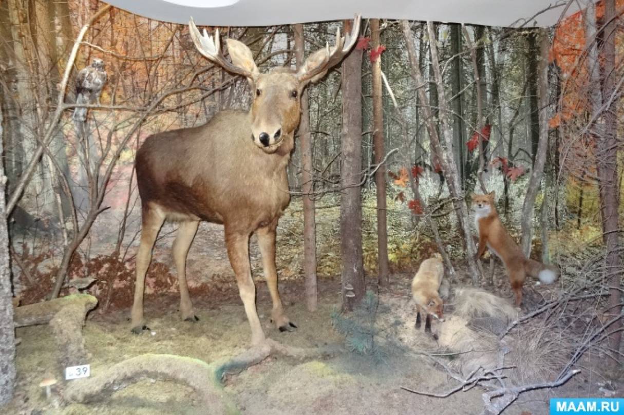 В залах оформлены композиции – диорамы, которые наглядно отражают условия обитания, отдельные характерные эпизоды из жизни лесных обитателей.