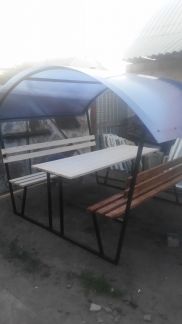 Каркас из трубы 40х20 мм, болты, саморезы, столешница и лавки, поликарбонат 4 мм.(Синий , зеленый, желтый, оранжевый, красный, коричневый и другие -15000) В комплект изделий входит вся необходимая фурнитура (упакована в картонную коробку)