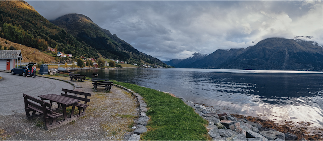 Спасибо Норвегии, буквально в километре от ремонтных работ был вот такой уютный дорожный карман. С видом на фьорд, горы, скамеечками, мангалом для барбекю (!) и бесплатным туалетом. Там вообще везде туалеты бесплатны и продуманны. Нет, серф машина не наша :)