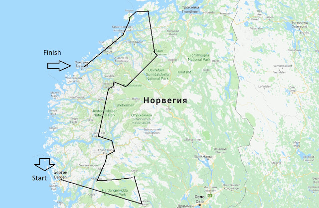 Наше путешествие по Норвегии длилось 7 дней. Карта маршрута выглядела как-то так. Ну картограф из меня не очень :)