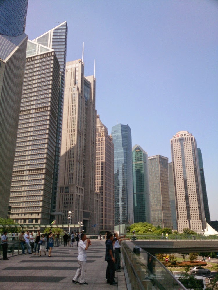 Мы приехали на станцию метро Лудзядзуй (陆家嘴 | Lùjiāzuǐ), особо не разбираясь, какой именно выход нам необходим. Просто вышли на улицу и уже на месте сориентировались, что надо подняться на надземную пешеходную улицу. Побродили, сделали пару кадров и направились в Шанхайский всемирный финансовый центр или просто "Открывашку", конечно же, названную так за свою форму.