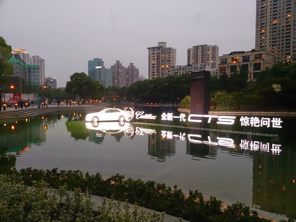 А мы идем дальше, по дороге Fuxinzhonglu. Погода приятная, вечереет, машин - минимум. Красота! Дойдя до станции метро Синьтяньды ( 新天地 | X īntiāndì), можно смело заворачивать нале во. Этот район полон разнообразия супер-маркетов и ресторанов. Тут же и п арк - Taipingqiao gongyu an (太平桥 公园 | T àipíngqiáo gōngyuán) , который достоин внимания. Здесь полно зелени и спокойствия. Некоторые занимаются вечерней гимнастикой, кто-то бегом, а мы просто прошлись вдоль пруда, где запечатлели интересную рекламу Cadillac.