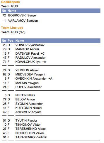 Нападающие: Александр Овечкин, Владимир Тарасенко, Артем Анисимов, Виктор Тихонов, Валерий Ничушкин, Алексей Терещенко, Александр Попов, Николай Кулемин, Александр Радулов, Александр Семин, Павел Дацюк, Александр Свитов, Евгений Малкин, Илья Ковальчук.