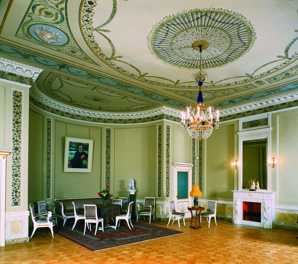 В Зеленой комнате на потолках в медальонах изображены святые — покровители знатного рода Юсуповых.