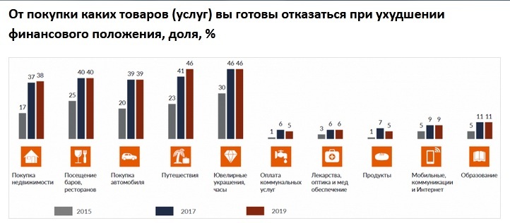 Если говорить об общей тенденции последних лет, начиная с 2015 года, то можно сказать, что при ухудшении своего финансового положения потребители все чаще стали отказываться от тех или иных покупок. Люди стали менять структуру своей потребительской корзины. Главным образом, в "черный список" попали дорогие покупки, например, автомобили, ювелирные украшения. Однако, и посещение ресторанов, хоть оно и стоит дешевле кольца с бриллиантами, тоже оказалось в исключительном списке.