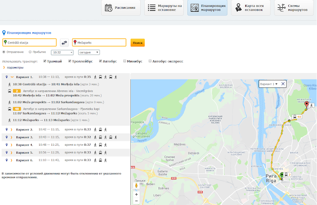 Чтобы вам было удобнее построить маршрут с помощью общественного транспорта, то рекомендую также зайти на сайт Рижского общественного транспорта Rigas Satiksme. Там есть удобная карта, которая легко позволит вам построить маршрут, к примеру, от ж/д вокзала до Межапарка.