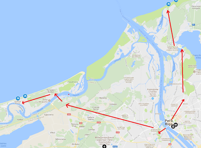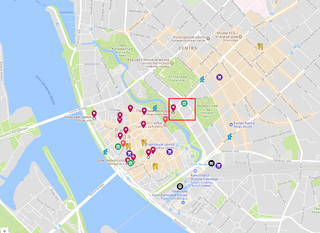После прогулки по туристическому центру Старой Риги можно погулять по улицам Бривибас и А.Чака, посетив парк Кронвальда и Верманский сад. Приблизив карту, вы сможете увидеть другие достопримечательности Риги, обозначенные уже не маркерами, а по умолчанию картами Google, но которые являются уже второстепенными.
