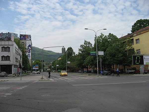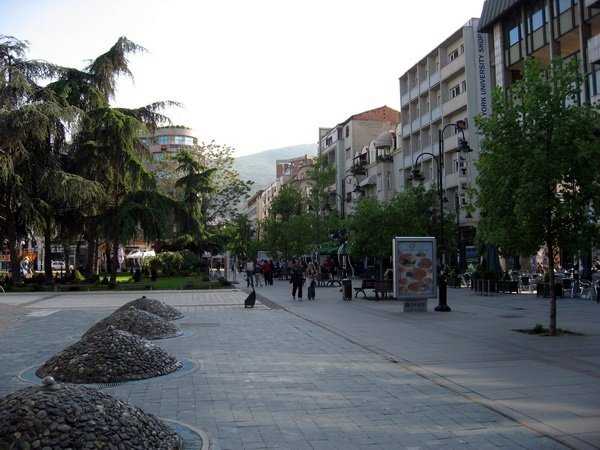 Бульвар маршала Тито, Скопский Арбат. "Прыщи" слева - это фонтаны.