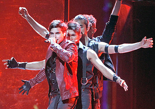 Репетиция с несколькими прогонами песни Get You заняла чуть больше получаса. И на ней можно было увидеть все - ну, или почти все. И сальто назад, которое Алексей делает во время исполнения, и кроссовки со святящейся подошвой, и плащи у танцоров, а у солиста - куртку со светодиодами на спине, и фейерверк по полукругу сцены, и две передвижные светящиеся стены.