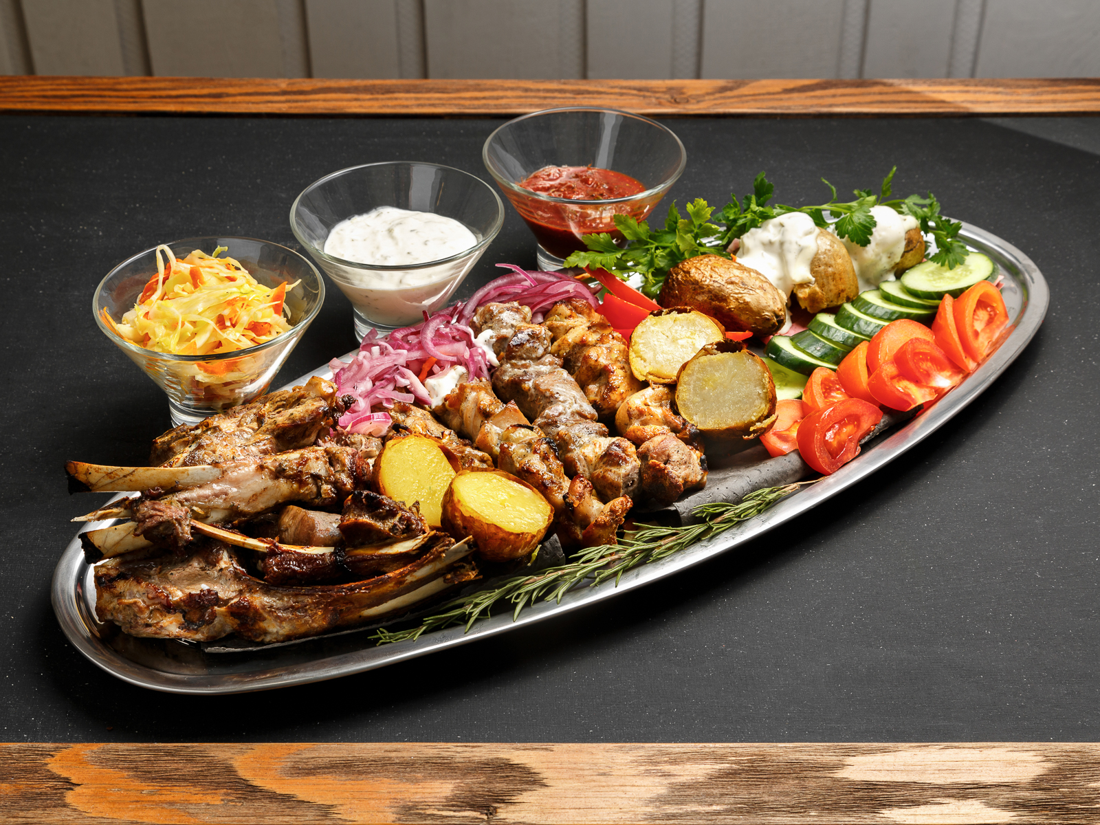 Каре барана 240 гр ,шашлык свиной 240 гр , шащлык куриный 240 гр,гарнир +лаваш+соуса 1500гр