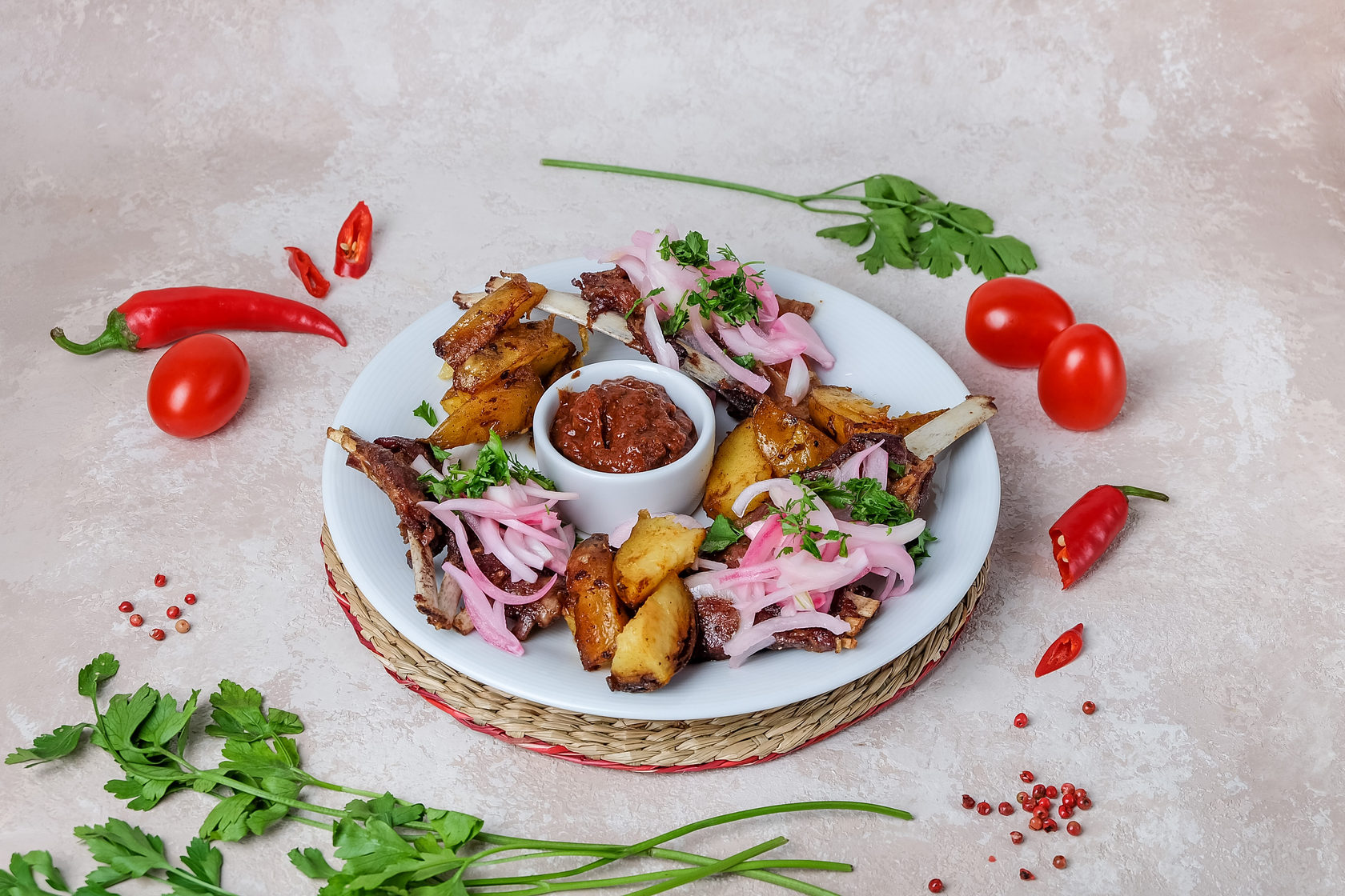 Блюдо готовится в казане; ребра барана, картофель ,лук маринованный.