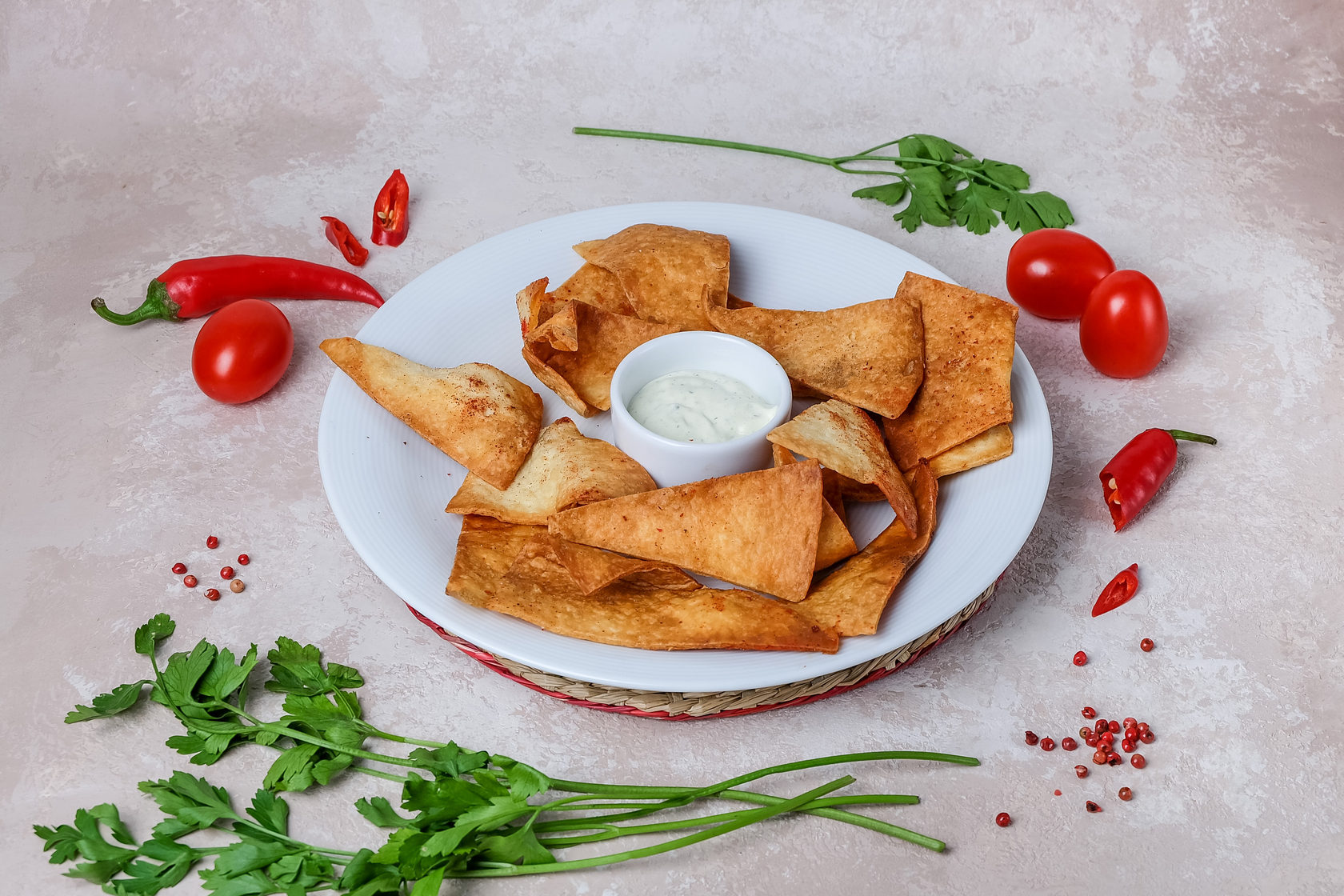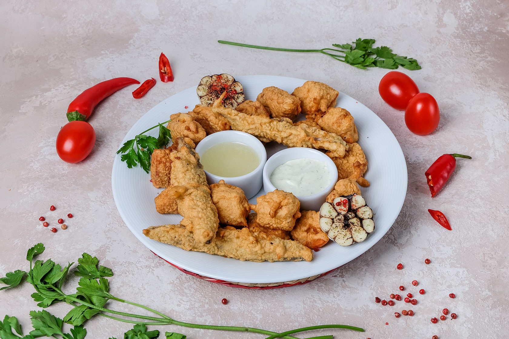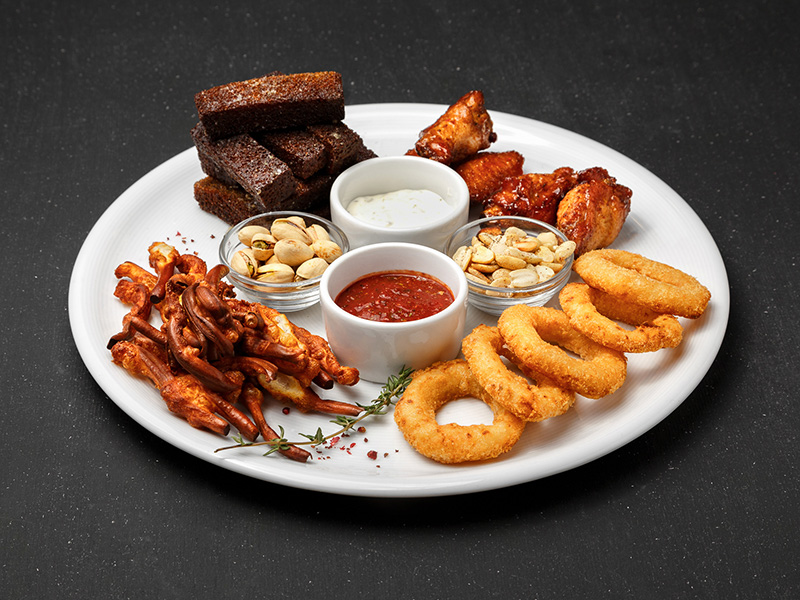 Гренки чесночные, сыр косичка, куриные крылья в глазури и т.д. 550 гр.