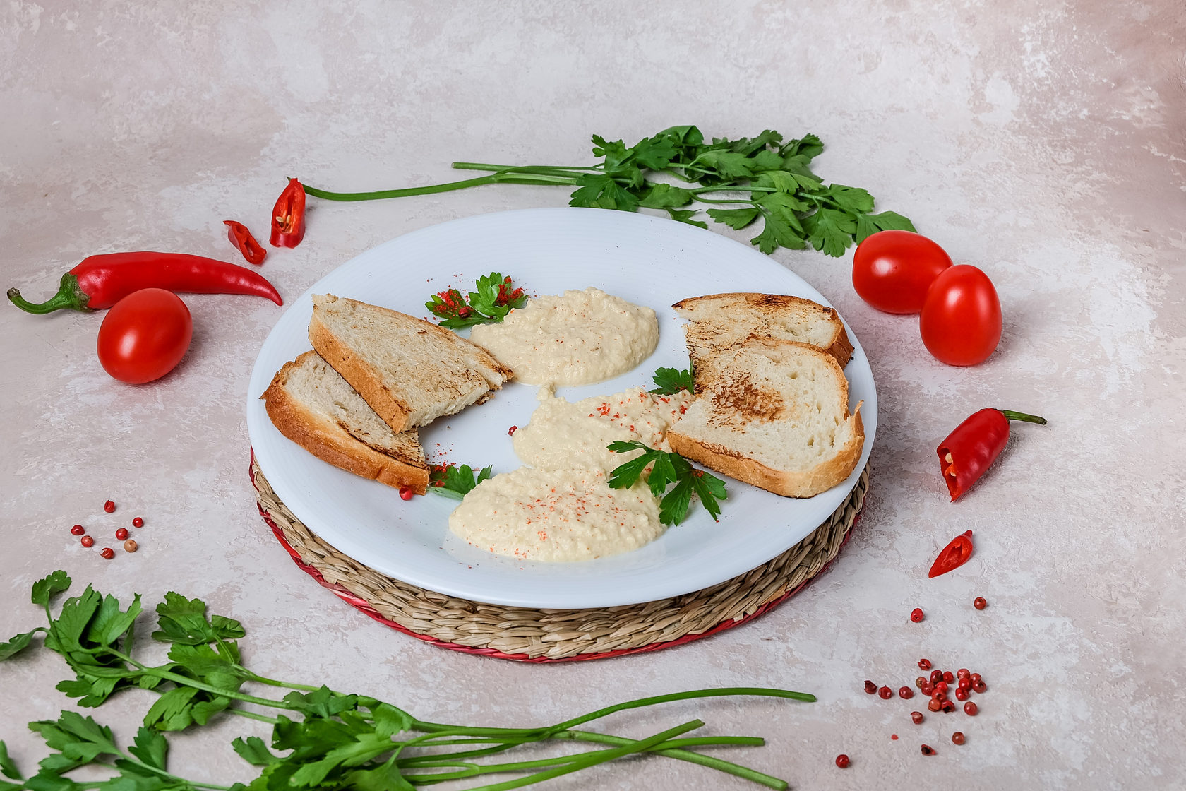 Закуска из нута ,паста тахини, кунжут, копченая паприка ,оливковое масло ,хлебцы