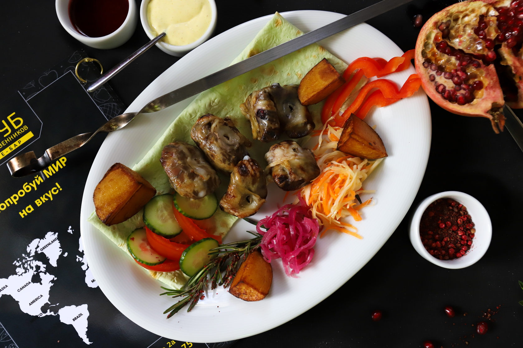 Картофель с грибами по-мински, Шашлык куриный, Пицца Мясная 33 см