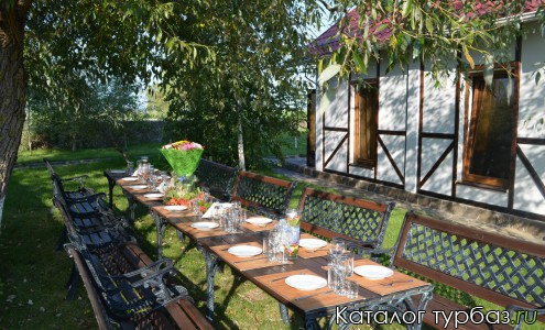 Открыт уютный ресторан на первом этаже гостиничного корпуса. Готовят блюда по меню, а также из только что выловленной рыбы из собственного пруда. В ресторане два зала – каминный и барный. Есть открытые обеденные беседки. В ближайшем поселке есть кафе и продуктовые магазины.