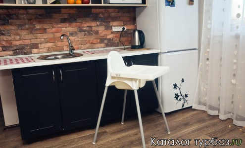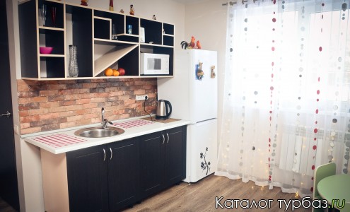 В гостевом доме расположена кухня с бытовой техникой и посудой.