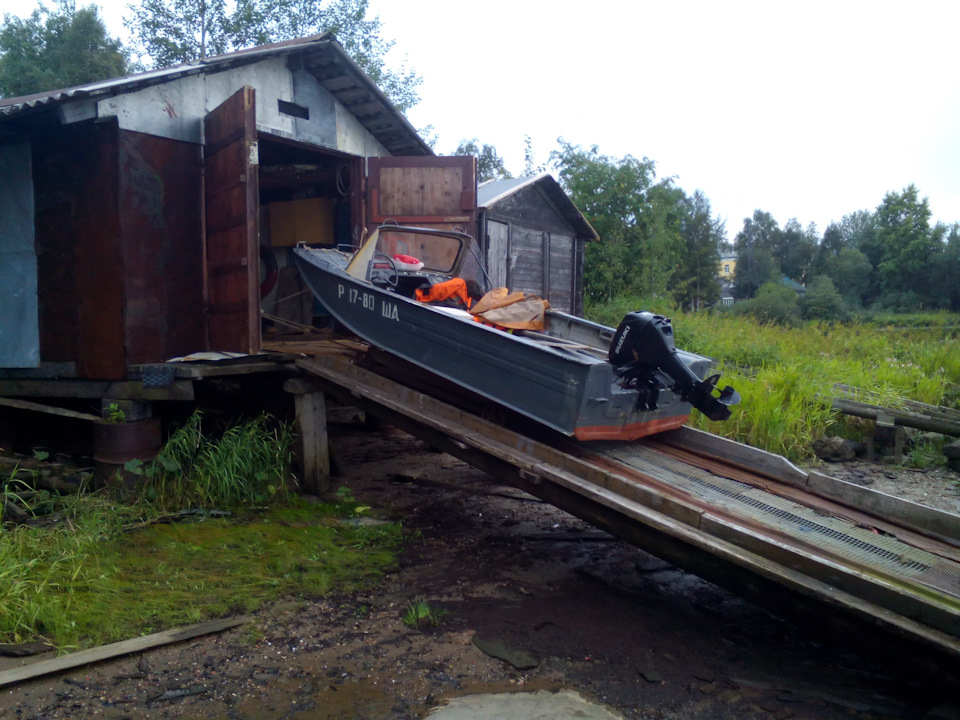 Хранится она теперь не у водного гаража, а в нём. Для этого из подручных средств был сооружен специальный пандус по которому перетягивается деревянная тележка