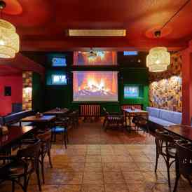 - На 75 мест — зал оформлен в стиле классического паба: массивные столы из дерева, красные оттенки, атмосферные детали интерьера