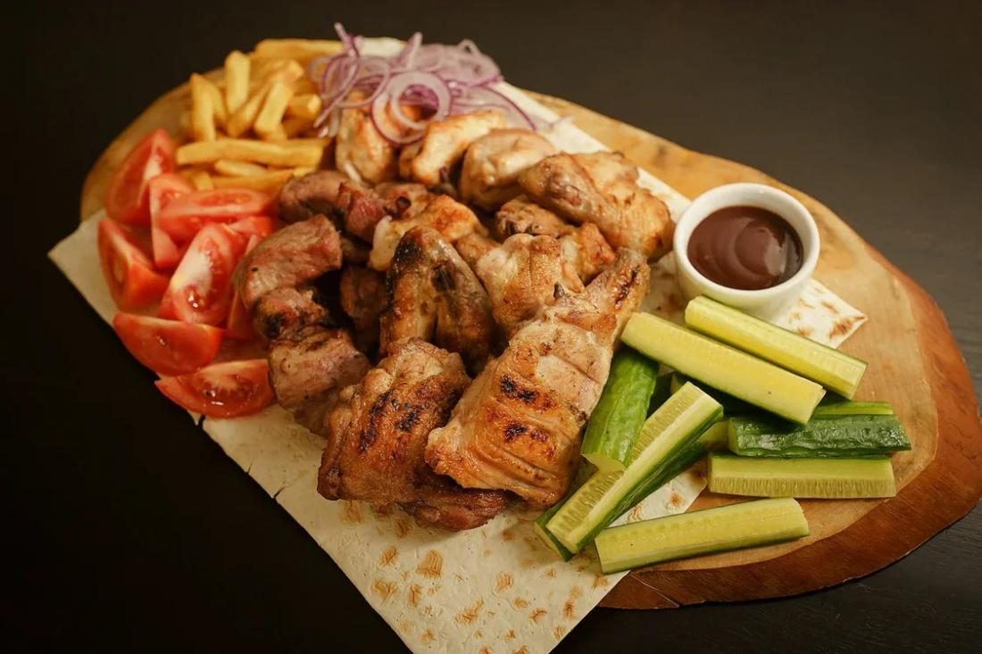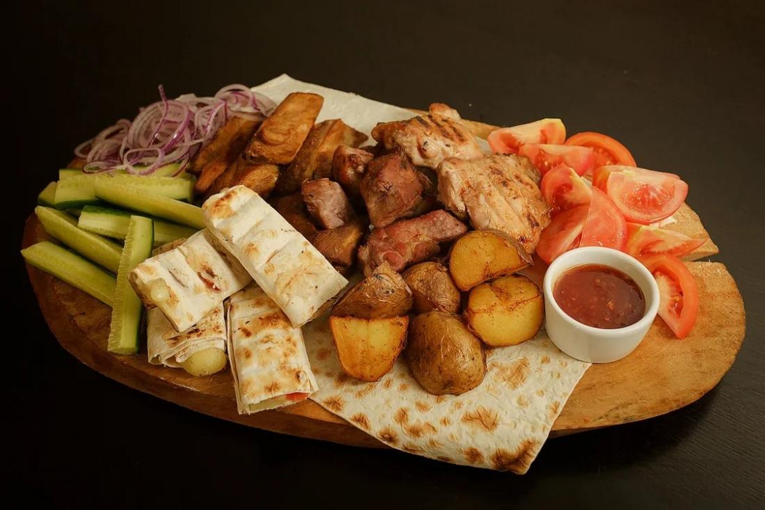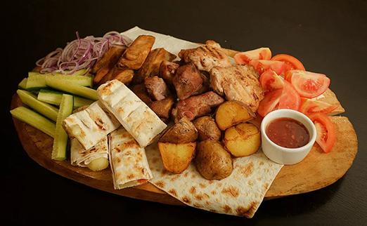 Состав: св. шея, св. рёбра, кур. бёдра, сулугуни-гриль с томатами, картофель в кожуре, св. огурец, св. помидор, соус "Сладкий чили", лук, лаваш.