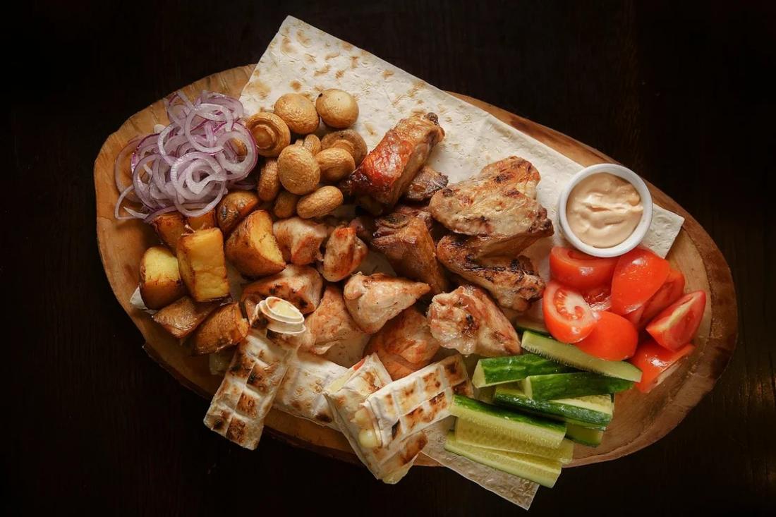 Состав: св. рёбра, кур. филе, кур. крылья, сулугуни-гриль с томатами, шампиньоны-гриль, картофель в кожуре, св. огурец, св. помидор, соус "Русский", лук, лаваш.