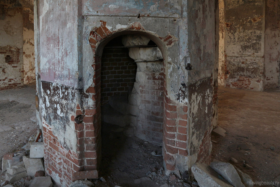 была переделана под школу. А после строительства сельской школы рядом заброшена. Сейчас внутри можно снимать фильмы ужасов. Проваленные полы и потолки, пробитые стены, сгнившие ступени. Стараясь максимально себя обезопасить, побродили немного по дворцу – впечатляет.