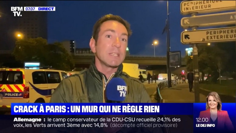 СЕДРИК ФЭШ, репортёр программы «Первый выпуск»: О, вы легко это поймёте благодаря расположению на местности. Я стою в Париже, позади меня вы видите окружную дорогу, а по ту сторону дороги — пригороды Пантен и Обервилье. А стену построили позади меня, вон там, под окружной дорогой, чтобы токсикоманы, которых вывезли сюда, не перебрались в соседние города. Токсикоманы находятся там, вы их не видите, потому что темно, их около 50 человек.