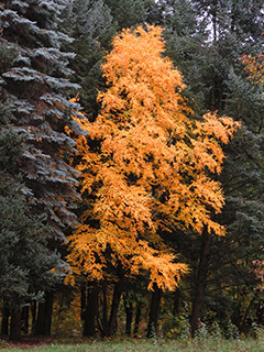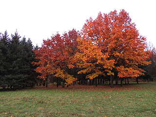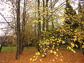 При достаточном количестве осадков и прохладных ночей в сентябре-октябре многие растения дендрария меняют свою летнюю окраску на осеннюю, часто более яркую. Растения в дендрарии собраны из разных уголков земного шара. И именно сейчас различия между видами одного рода особенно заметны. Коричневая листва дуба черешчатого (Европа) оттеняет охряно-желтую листву дуба красного (Северная Америка). Оранжево-золотая окраска листвы березы вишневой (Северная Америка) оспаривает первенство яркости с лимонно-желтой листвой березы Радде (Средиземноморье). Спирея Вангутта (гибридное происхождение) не каждый год успевает до холодов сменить окраску. Но в ту осень горит красно-фиолетовым пламенем на фоне желтой листвы спиреи дубравколистной (Дальный Восток). Даже хвойные растения, про которые мы с детства привыкли говорить: «Зимой и летом одним цветом», на самом деле осенью тоже меняют окраску и сохраняют ее до начала распускания почек весной. Особенно это заметно у форм туи западной (Северная Америка). Например, туя западная форма Эльвангера золотая становиться осенью буровато-оранжевой.