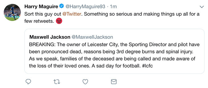 Защитник «Лестера» Харри Магуайр просил вышвырнуть из твиттера тех, кто распространяет слухи о погибших.
