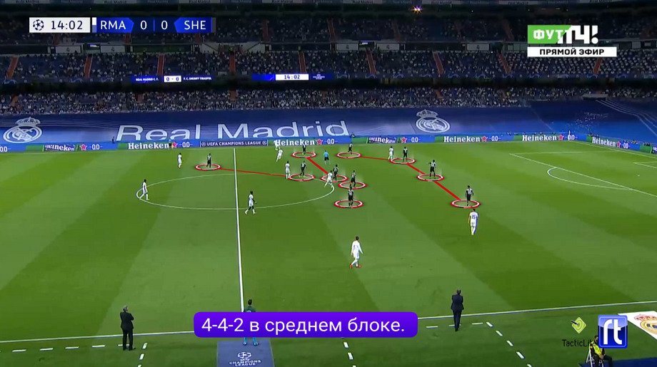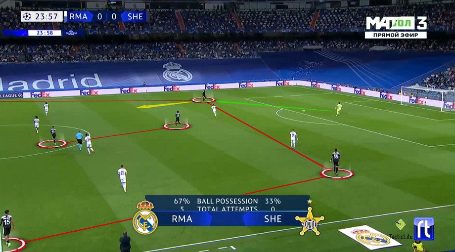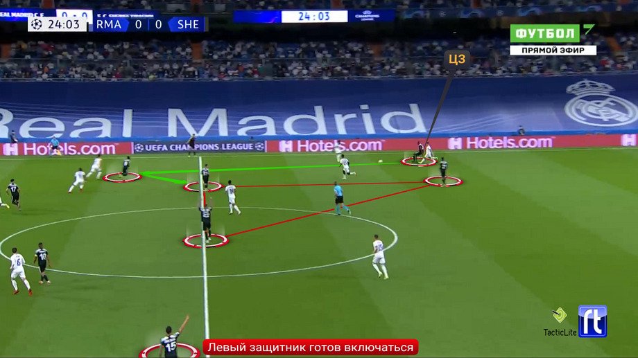 Что сделал «Шериф»? Выставил свою базовую структуру 4-2-3-1. И по игре в первом тайме было заметно, что команда Вернидуба не собиралась садиться совсем низко. Оборонялась она преимущественно в среднем блоке, пространство за спинами наблюдалось, ключевой задачей становились насыщение центра и направление атак «Реала» на фланги.