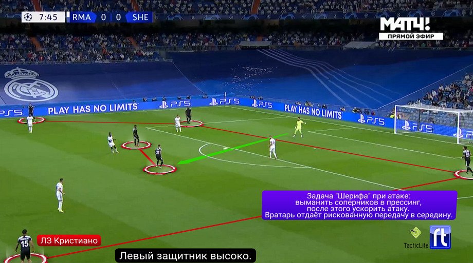 «Шериф» играл гораздо сложнее. Стратегической целью команды Юрия Вернидуба стало выманивание «Реала» в прессинг – для этого она применяла предварительные короткие розыгрыши. В частности, «Шериф» разыгрывал подавляющее большинство свободных ударов, да и в игровых моментах старался сначала находить кого-то из опорников. И лишь после того как «Реал» бежал в прессинг, могла пойти нацеленная длинная передача в сторону поднявшихся повыше нападающих.