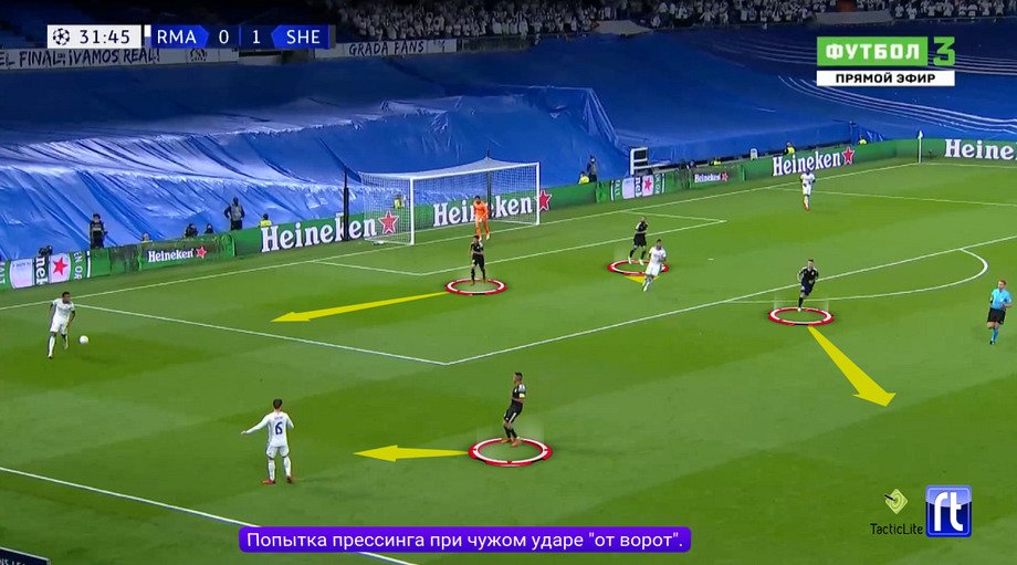 В некоторых ситуациях – не очень часто, но всё же – «Шериф» даже пытался организовать прессинг. Стабильно был контрпрессинг после собственных потерь, эпизодично – давление при обратных передачах «Реала». Или, например, «Шериф» выставлялся при чужих ударах «от ворот» и пробовал отнять мяч высоко.
