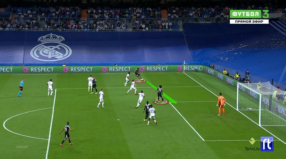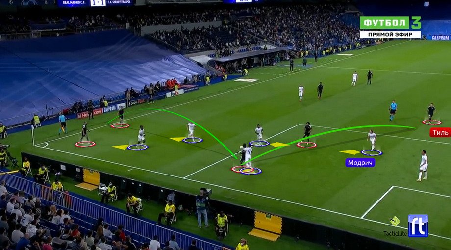 Траоре быстро отыгрывается на поднявшегося Тиля. Прессинг «Реала» сброшен. Тиль не сталкивается с давлением, разворачивается – и диагональю переводит атаку налево, на включившегося высоко левого защитника.