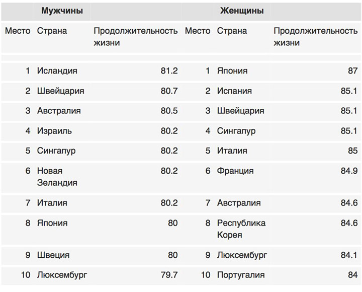 А вот как выглядит рейтинг средней продолжительности жизни по странам в зависимости от пола: