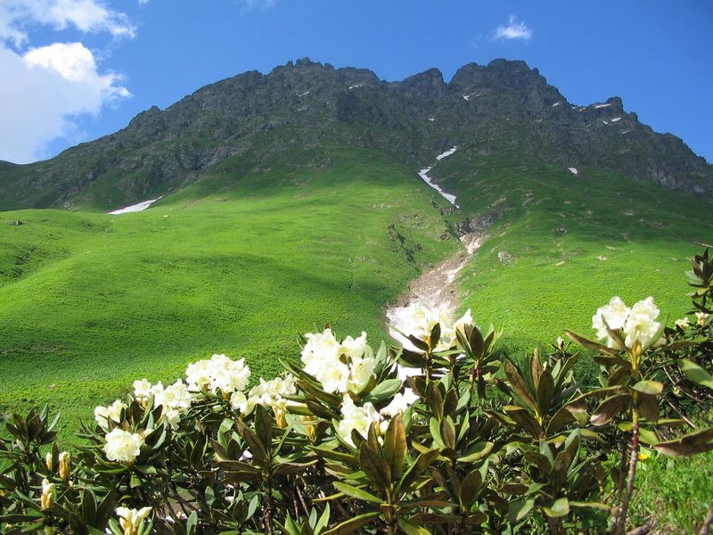 В начале июня в этих местах можно увидеть острова снега, цветущий рододендрон кавказский и прекрасный рябчик широколистный ( черный тюльпан). В июле - ошеломляющее богатство альпийского разноцветья и разнотравья, альпийский ковер, вытканный ярчайшими красками множества восхитительных цветов. Пожалуй, в это время года альпийские луга Абхазии производят самое сильное впечатление. В августе зеленые склоны гор оживляют лишь редкие краски - белые, желтые и сиреневые цветы безвременника.