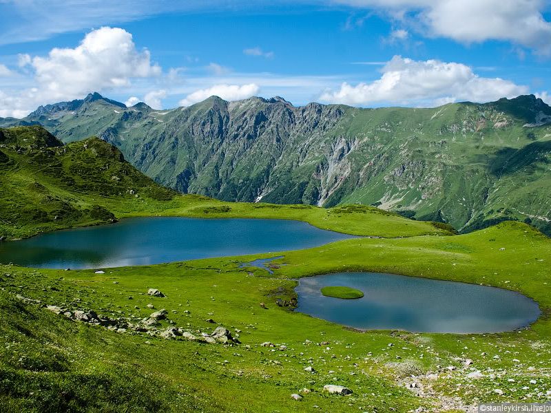 После нескольких крутых подъемов взору открываются захватывающий вид на озера, горы и Главный Кавказских хребет.
