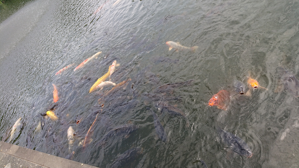 Естественно пруд с карпами размером с небольшую собаку. Тут их в отличии от Токио не стесняются подкармливать.