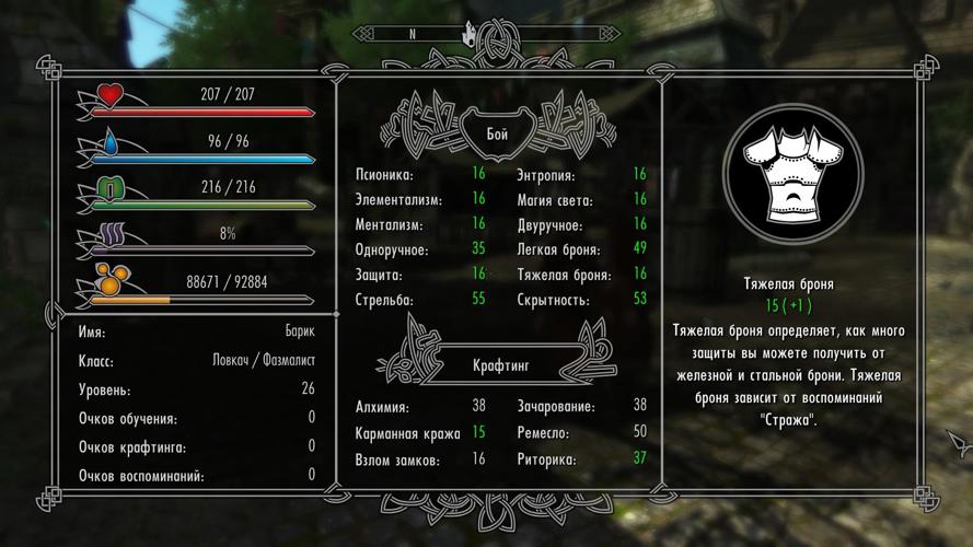 Enderal, как было сказано ранее, сделан на базе Скайрима, но вся механика прокачки персонажа переделана, грубо говоря, с основания. Вас не ждет повышение уровня за каждый чих какого-либо действия в игровом процессе. Чтобы улучшить свои навыки, вам придется находить или же покупать книги с нужными для вас навыками. Также книги распределяются на категории: ученик (1-25 уровень), адепт (25-50 уровень), эксперт (50-75 уровень) и мастер (75-100 уровень). Вы не сможете просто так прочесть книгу мастера одноручного оружия, если ваш персонаж находиться на 25 уровне этого навыка. Или же раздобыв на первом уровне гору обучающих книг, вам не дадут их прочитать за один раз, так как в игре присутствует несколько видов очков для прокачки нашего персонажа.