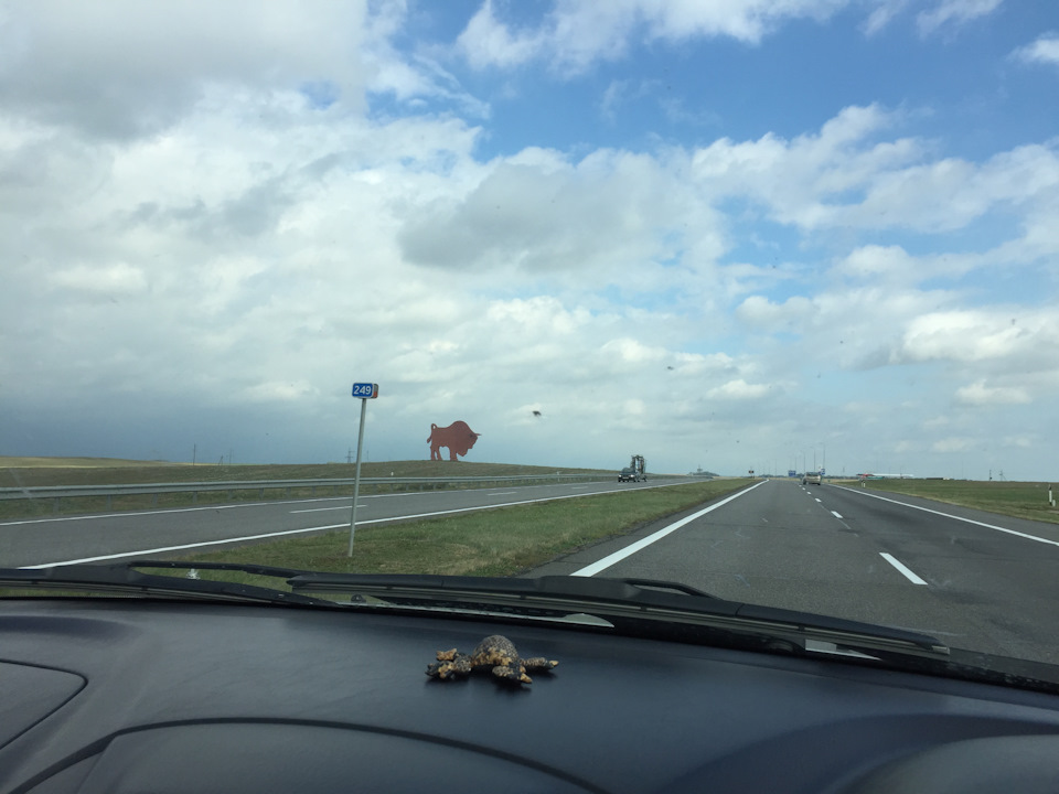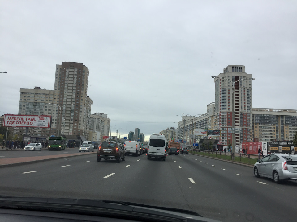 Дальше двинули к Минску. Если бы не этот отбойник с газоном, у меня сложилось бы ощущение, что мы к Москве подъезжаем из-за количества трафика и серой погоды)