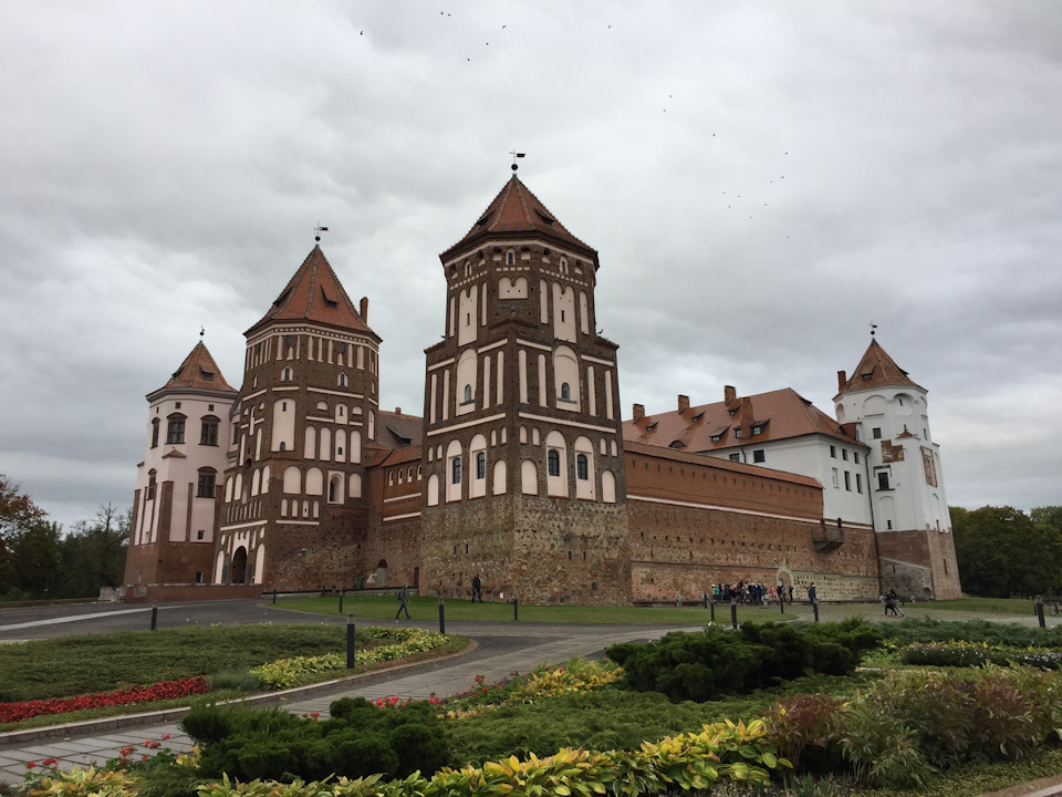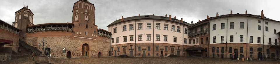 Но как только мы свернули к Мирскому замку, по небу шла серая волна. Короче, нас накрыл дождь. Но погулять, всё равно, получилось. На экскурсию не пошли, не очень то хотелось, но остановка на тему "размять ноги" — самое то.