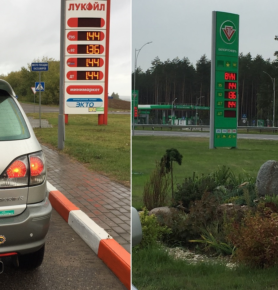 На протяжении всего пути цена изменялась максимум на 1 копейку (и то в Минске). Бензин, со слов местных, под строгим надзором, да и я сам не замечал разницы в поведении машины (опробовал 3 сети — лукойл, белнефтехим и белещёчтототам). Но всё же старался заправляться на основных магистралях))