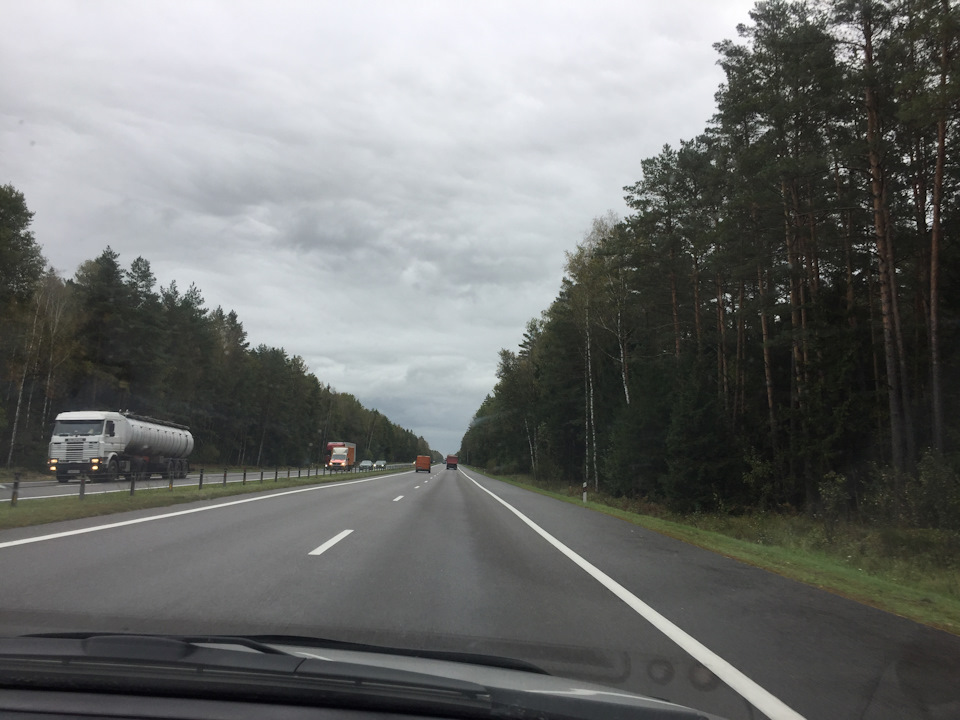 Я её разделил на 3 участка. Первый — это до Свислочи; второй — до Пружан, третий — до Бреста. Так вот, первый участок он маячит где-то между 4 и 4,5 баллами (из 5). Колейности нет, встречаются редко заплатки. Если ехать 60, то она идеальна, но. Вы посмотрите последнее фото из прошлой записи, какие там нафиг 60, я ехал 110 и то, себя сдерживал. После Большой берестовицы, машин ваще нет. Дорога везде насыпная, но на скорости от 100, жена спать не смогла, вечно машину подкидывало. А когда могла, я её будил, словами "есть там кто?"))))) мммм это прям вишенка на торте, ей же спать хотелось)) Но потом мне человечка стало жалко, и я выезжал на встречку метров за 200 до обгоняемой машины (главное противотуманки не выключать, чтобы видели), они там все до 100 едут, а грузовики и того меньше, но все сразу уходят вправо. Хорошее покрытие было на участке между Берестовицей и Свислочью по дороге Белосток (Польша) — Волковыск (Беларусь), т.е. у границы (оно и понятно), но по нему ехать надо было километров 5, далее направо сворачивать.