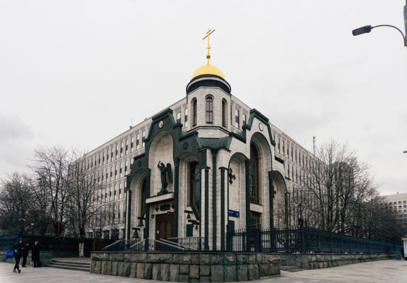 Его современный фасад обманчив. Зайдя внутрь, оказываешься в традиционной, богато украшенной намоленной, как часто говорят, церкви. Интерьер выглядит намного старше реальных лет постройки. Стоит густой запах ладана. За церковным прилавком сидит вездесущая «храмовая бабушка» в платочке. Такая женщина неизменно сидит в каждом православном храме — торгует свечами и иконками. Иногда кажется, что это одна и та же бабушка. Меняются только пропорции ее лица и узор косынки. Я думаю, что храмовые старушки у прилавка — крайне значимый элемент церковной атрибутики. Если в новом храме не посадить несколько таких старушек, он будет казаться ненастоящим. Бабушка поведала довольно интересную историю о церкви. До того как в 1970-х возвели гигантскую белую коробку — управление МВД, на его месте располагался старый собор — церковь Казанской иконы Божией Матери у Калужских ворот. Это было большое и действительно красивое сооружение, пока его не взорвали в 1972-м. Иронично, но храм и старые дома сносили, готовясь к приезду американского президента Никсона. Получается, Никсон одним своим существованием снес парочку московских кварталов. В качестве «искупления» МВД профинансировало в 1990-х строительство этой маленькой церкви. По-своему это даже трогательно. Часто ли тут молятся сами силовики, старушка не раскрыла.