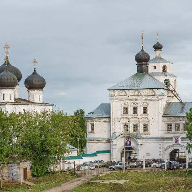 Шедевр А.П. Чарушина – автора проекта храма и особняка Булычева, просто завораживает. На архитектурный ансамбль, возведенный в 1907 г. на средства горожан, невозможно смотреть без придыхания. Пятиглавый собор с ажурным аркатурным поясом и колоритными кокошниками, изящный теремок-колокольня, здание трапезной создают великолепную композицию. С нарядным красно-белым декором фасада контрастируют черные шатры, барабаны, купола. Такого великолепия вы не увидите больше нигде.