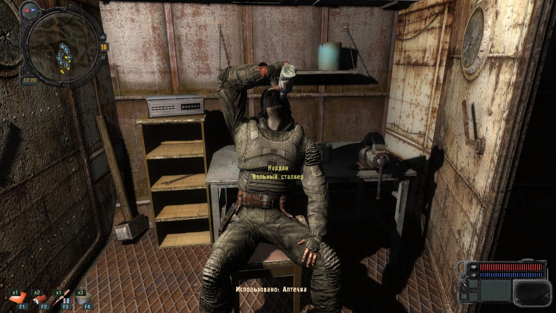 Разворачиваемся, В конце казармы видим двоих -Дока. Он-же Хирург, и ещё Одного. Похоже - это Главный. С кого начинать,без разницы,но проще с Хирурга. Он попросит Вас принести Хитрую Аптечку. Естественно недаром. Соглашайтесь . Это всё по пути.Попытайтесь поторговаться. Аптечки и остальное не мешает. В Зоне нет Жадных-Есть Запасливые. Они,как правило и выживают. Внимательно посмотрите на кол-во денег у Лекаря и запомните. Для чего,поясню позже.