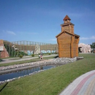 Есть также детская площадка с качельками, избушкой из брёвен и деревянной фигуры медведя.