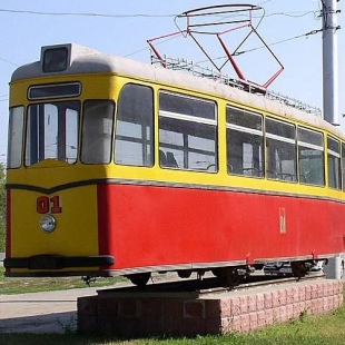 Памятник первому трамваю в Волжском - это вагон трамвая немецкой разработки марки GOTHA T 57, установленный напротив трамвайного депо. 25 таких вагонов вышли впервые на линию в 1963 году. Установленный вагон является прицепным, переделанным в моторный. Информация